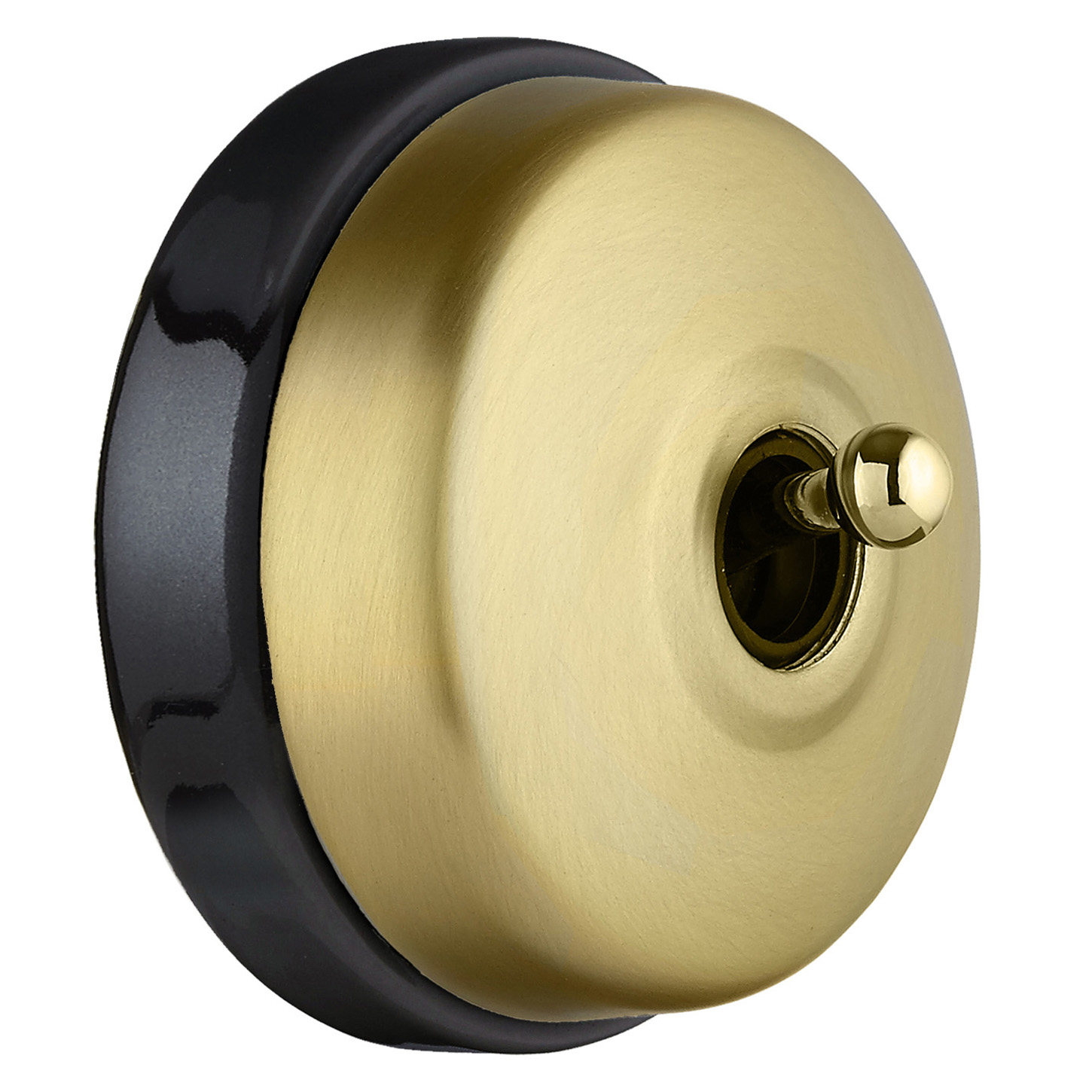 Seinän pintaan asennettava musta posliininen impulssikytkin metallikuorella.