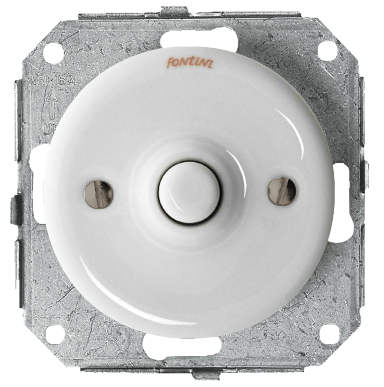 Seinään uppoasennettava painettava valkoinen katkaisin ilman kehystä, impulssikytkin.
