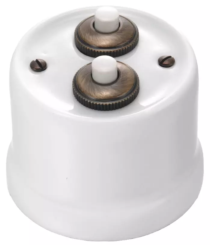 Materiaali Posliini, valkoinen. Kiinnitysruuvit ja metalliosat ovat patinoitua messinkiä. Painonapit valkoiset.
