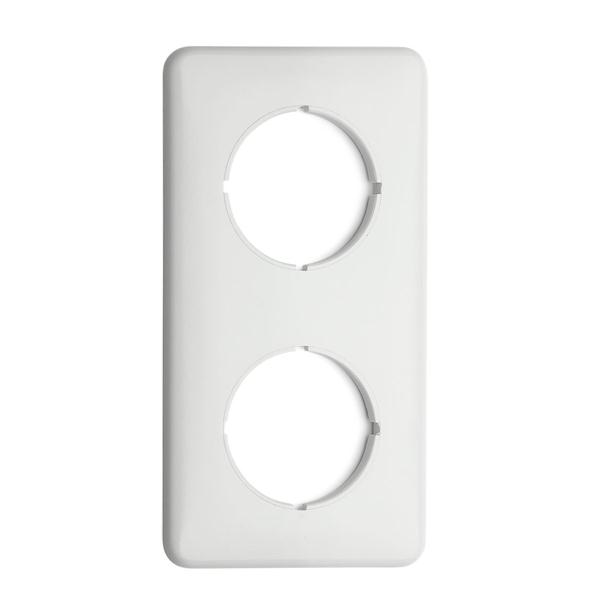 Seinään uppoasennettavan valkoisen sähkökalusteen kehys, kahdelle katkaisimelle tai kytkimelle.