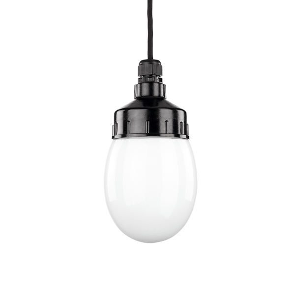 Lampunkanta bakeliittia, musta, lampunpidike E27 posliinia. Kattokuppi posliinia, musta. Kupu valkoista opaalilasia, pisaranmallinen. Tekstiilipäällysteinen johto, musta.