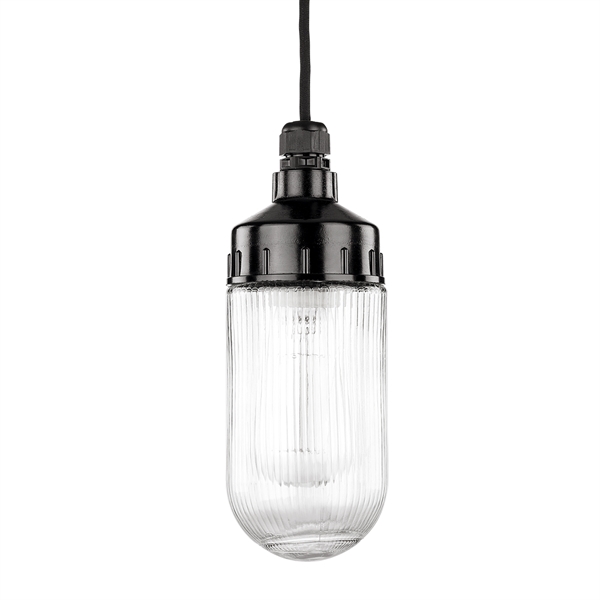 Lampunkanta bakeliittia, musta, lampunpidike E27 posliinia. Kattokuppi posliinia, musta. Kupu kirkasta puristelasia, kuvioitu. Tekstiilipäällysteinen johto, musta.