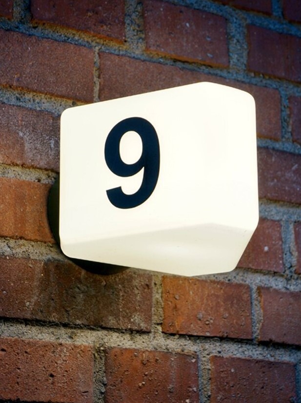 Kerrostalojen seinälle tai oven päälle asennettavan kolmiomallisen valaisimen talonumerot näkyvät kätevästi kumpaankiin suuntaan.
