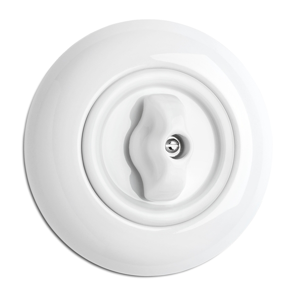 Seinään uppoasennettava väännettävä posliininen valokatkaisin, ns. kruunukytkin (5-kytkin).