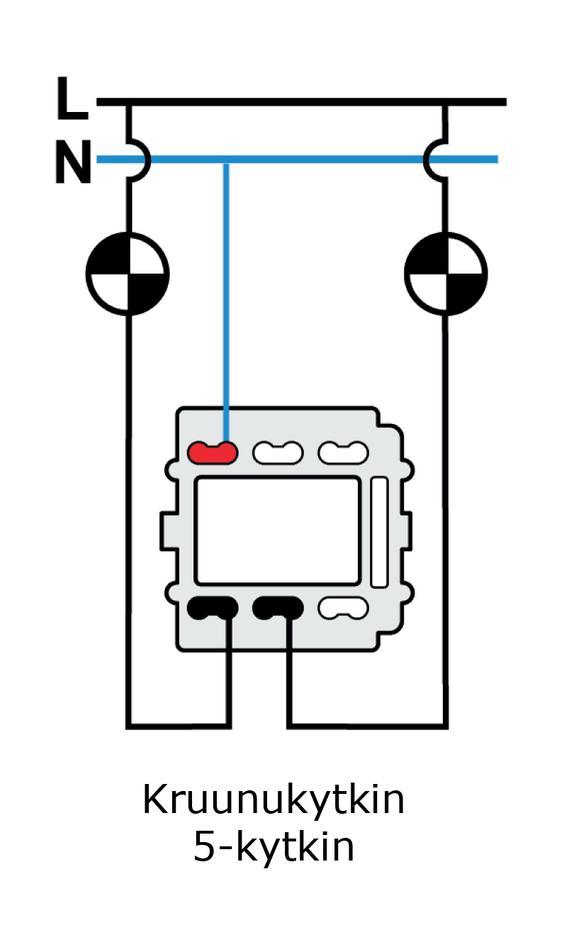 Kruunukytkin eli 5-kytkin voi ohjata esim. kaksiosaista kattokruunua tai kahta eri valaisinta, jotka ovat samassa linjassa.