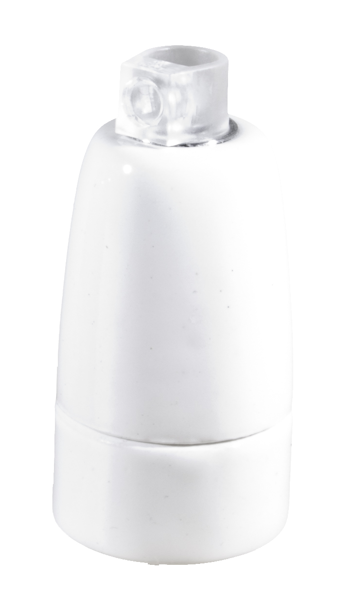 Posliini, valkoinen. Mukana läpikuultava vedonpoistaja, muovi.
