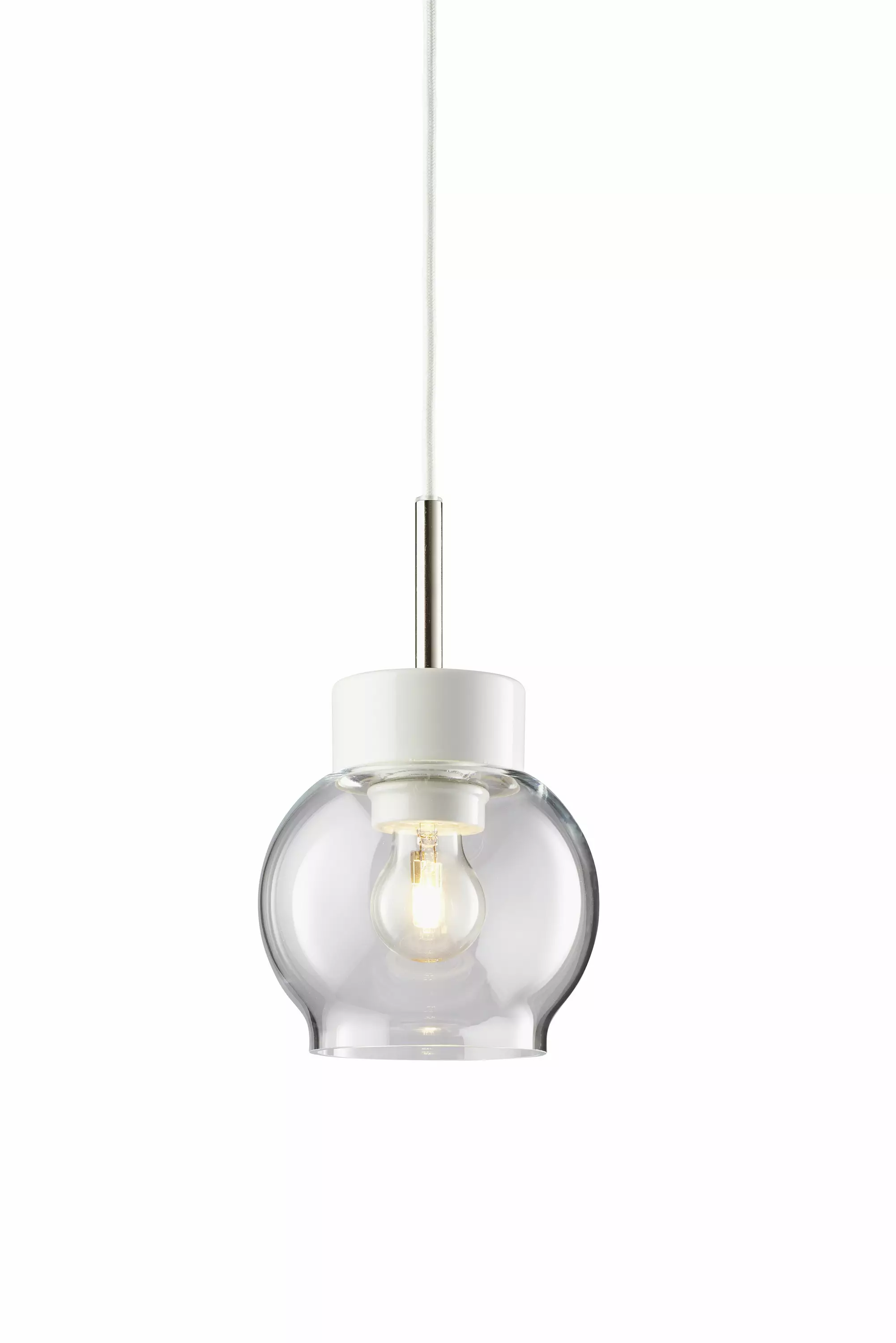 Kattovalaisin kirkaalla lasikuvulla, posliinisella kannalla ja valkoisella kangasjohdolla. Sisältää lampun pistokkeen.