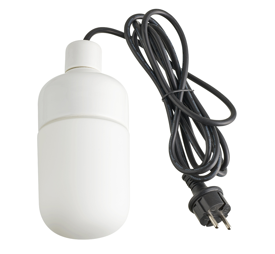 Ohm -sarjan ajaton ulkovalaisin kumikaapelilla sekä pistokkeella. Valaisimen voi kätevästi sijoittaa ulos, ulkorakennukseen tai muualle säälle alttiiseen tilaan sekä kylpyhuoneeseen.