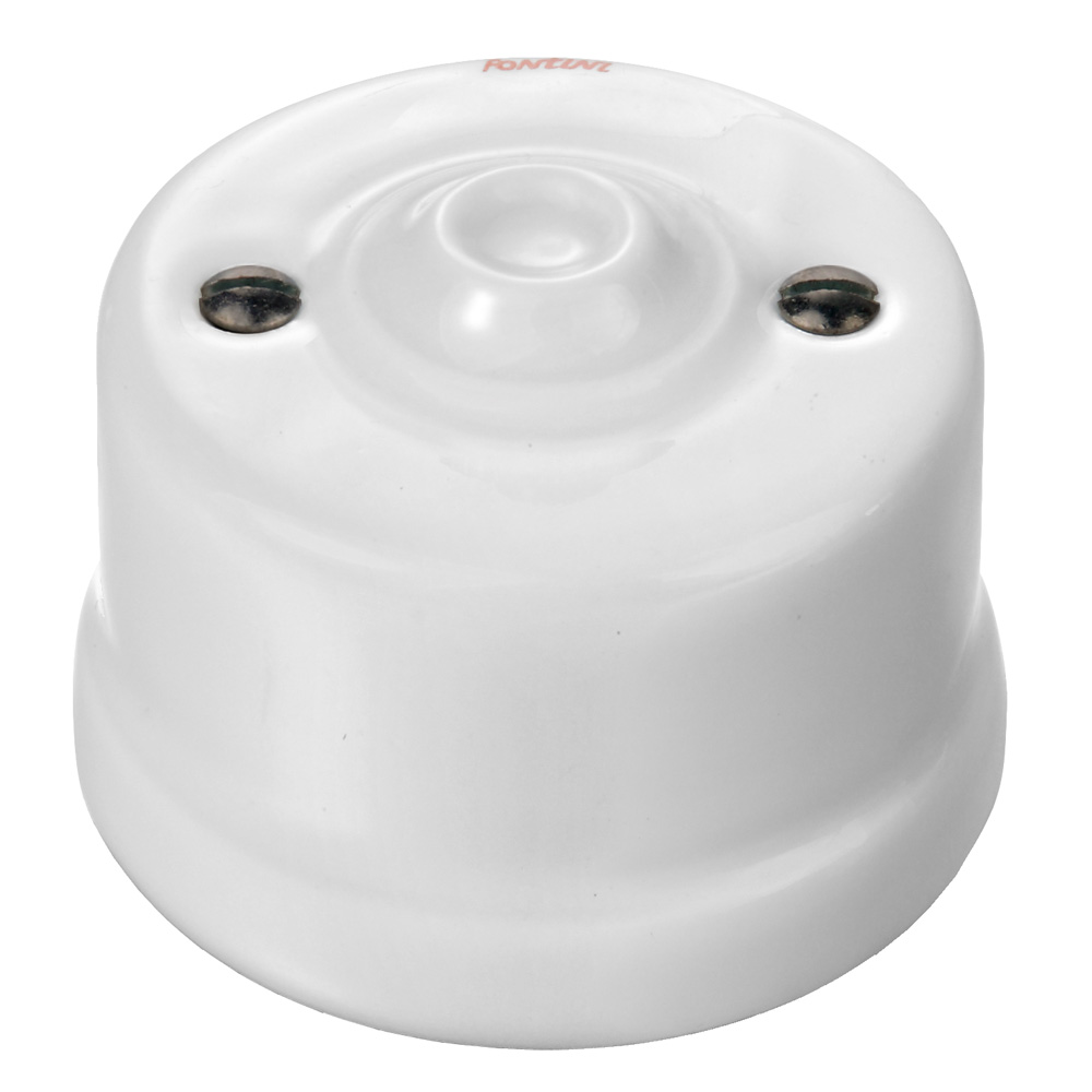 Posliini, valkoinen. Kiinnitysruuvit ovat patinoitua messinkiä.