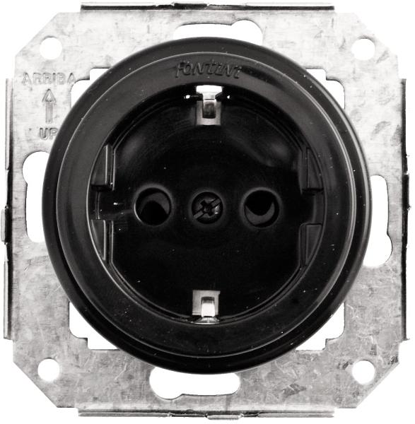 Seinään uppoasennettava maadoitettu musta pistorasia, lapsilukollinen.
