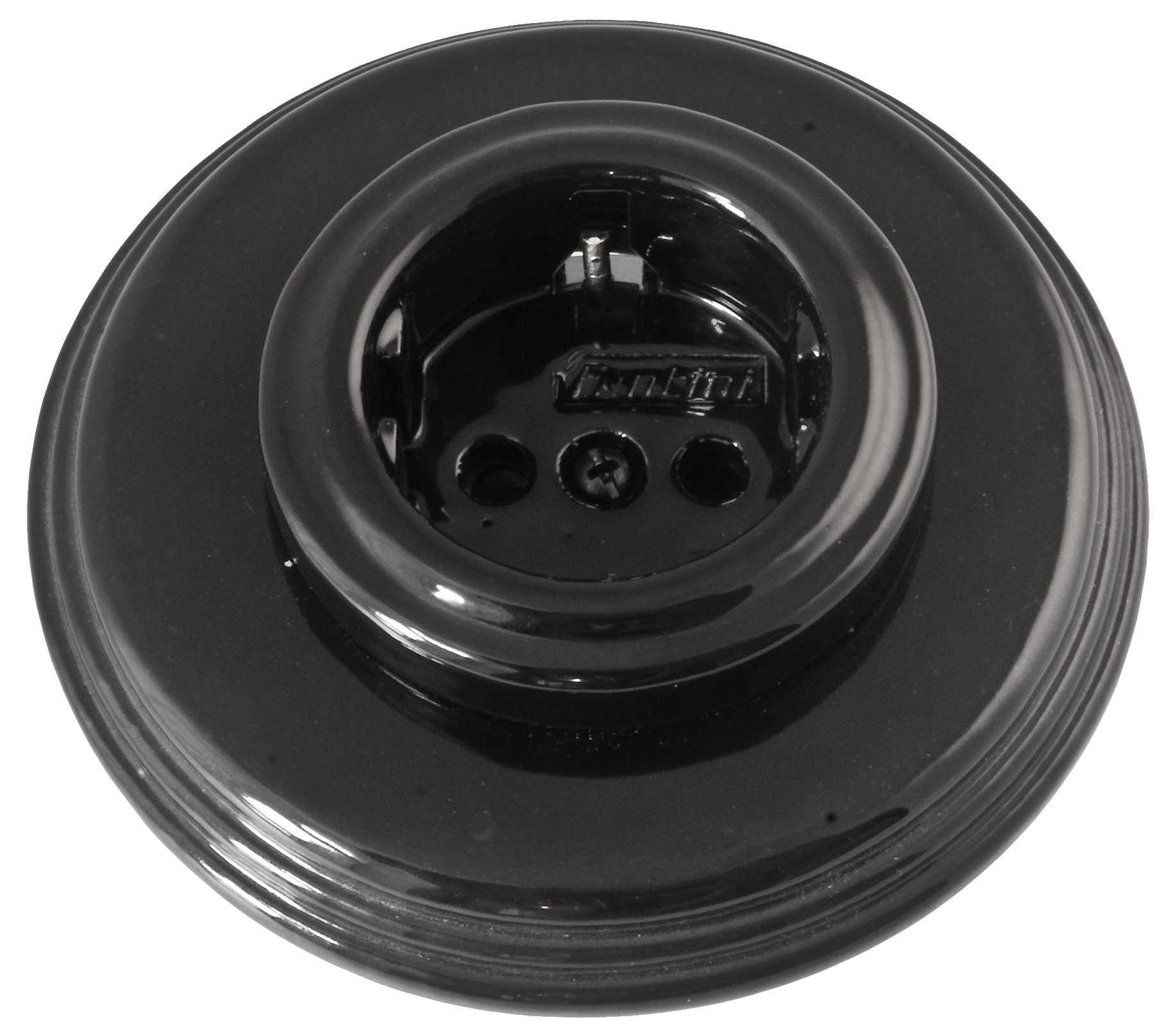 Seinään uppoasennettava maadoitettu musta pistorasia, lapsilukollinen.