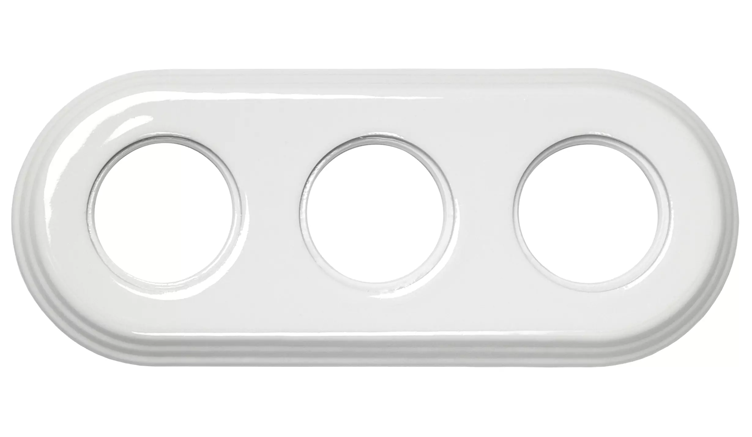 Seinään uppoasennettavan valkoisen sähkökalusteen posliininen kehys, kolmelle kytkimelle tai pistorasialle.
