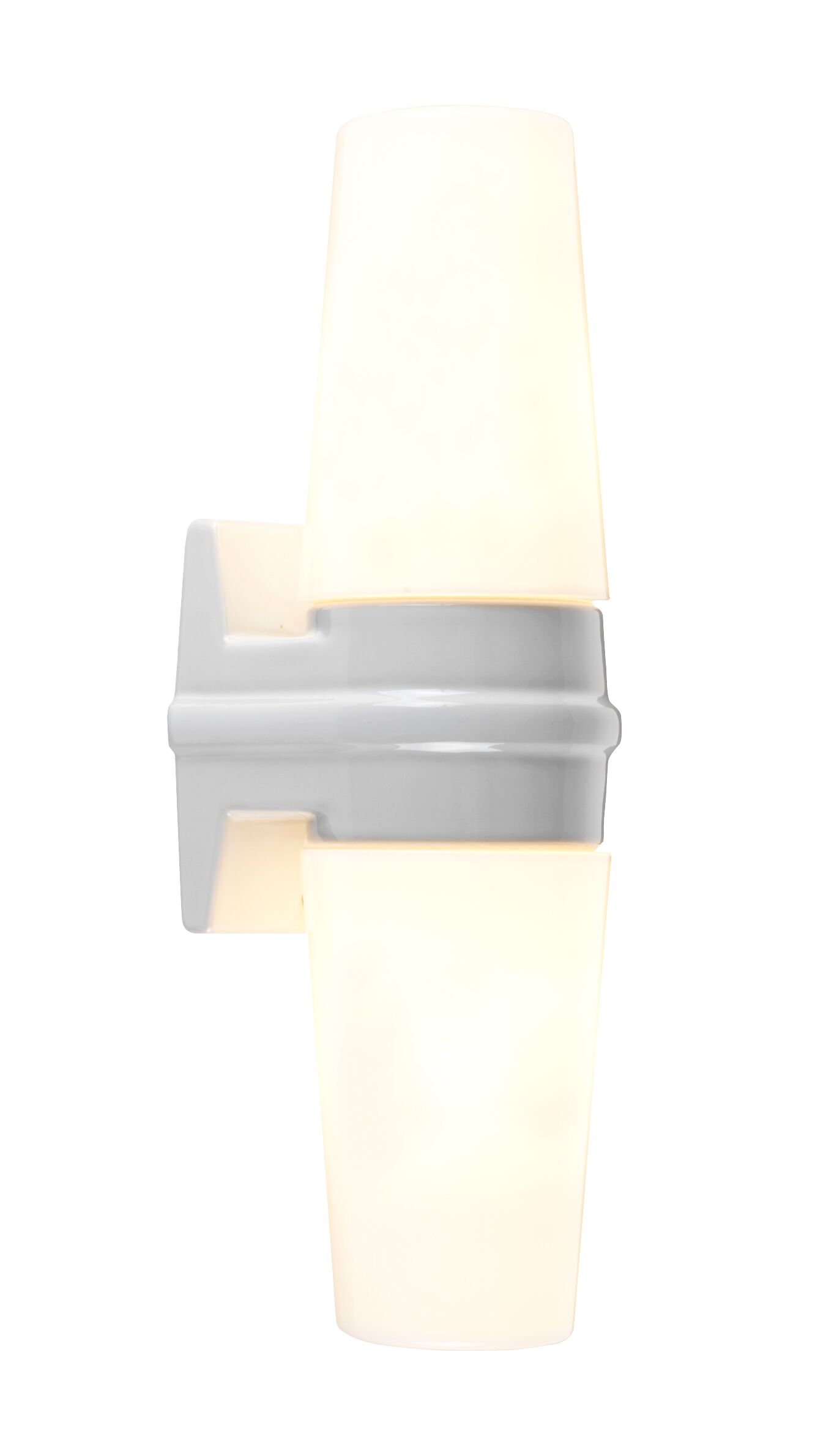 Seinään kiinnitettävä posliininen valaisin kahdella opaalilasikuvulla.