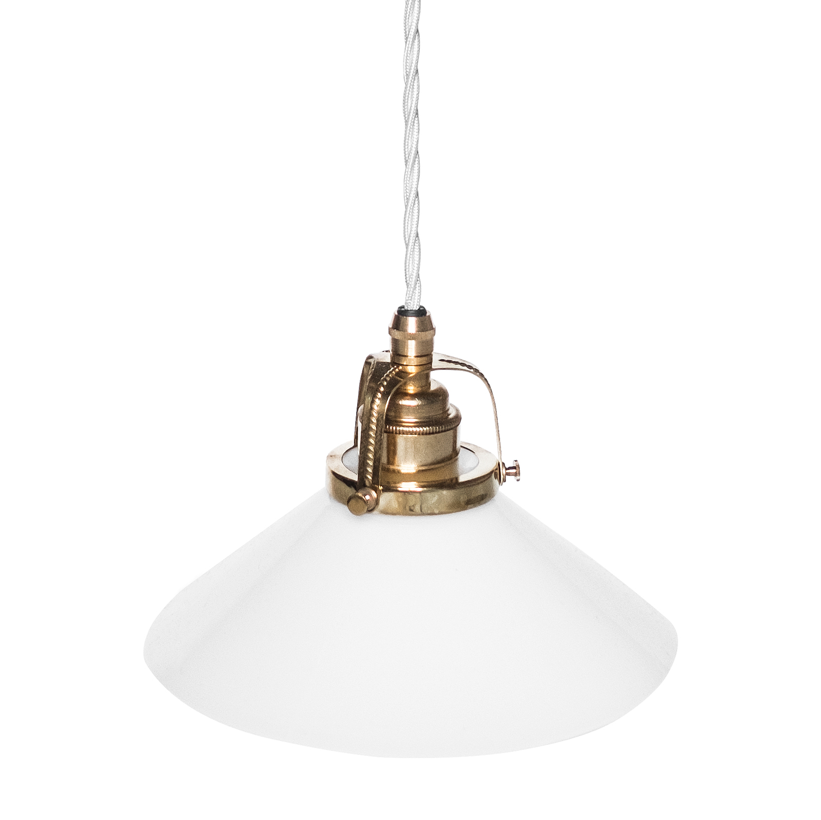 Materiaali Valaisimen varjostin on opaalilasia, johto punottu valkoinen kangasjohto. Muut osat ovat lakkaamatonta messinkiä. Tilauksesta valaisimen saa myös mustalla kangasjohdolla.