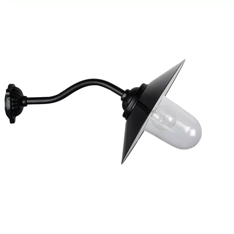 Perinteinen valurautainen tallivalaisin, kaarevalla varrella.