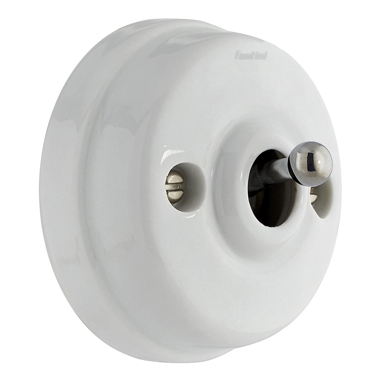 Seinän pintaan asennettava valkoinen posliininen valokatkaisin, ns. vaihto- tai porraskytkin (ns. 6-kytkin).