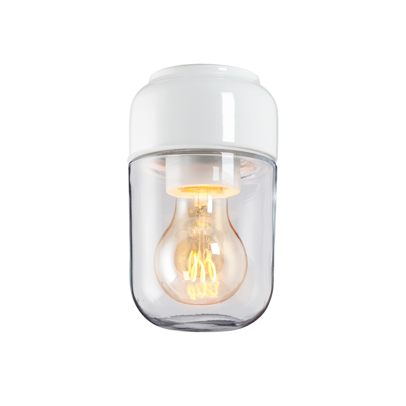 Valaisimen kanta on posliinia, valkoinen. Kupu kirkasta lasia.