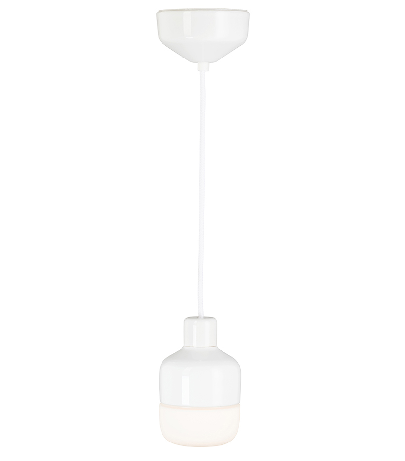 Valaisimen kanta ja kattokupu ovat posliinia, valkoiset. Johto tekstiilipäällysteinen valkoinen. Kupu mattapintaista opaalilasia.