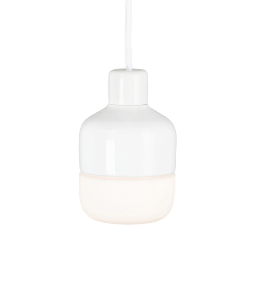 Valaisimen kanta ja kattokupu ovat posliinia, valkoiset. Johto tekstiilipäällysteinen valkoinen. Kupu mattapintaista opaalilasia.