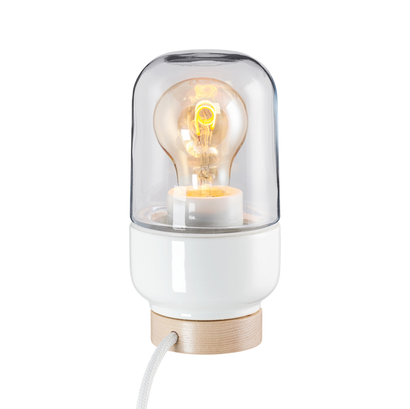 Posliinirunko, valkoinen. Kirkas lasikupu. Puinen jalusta, saarnia. Tekstiilipintainen johto, valkoinen.