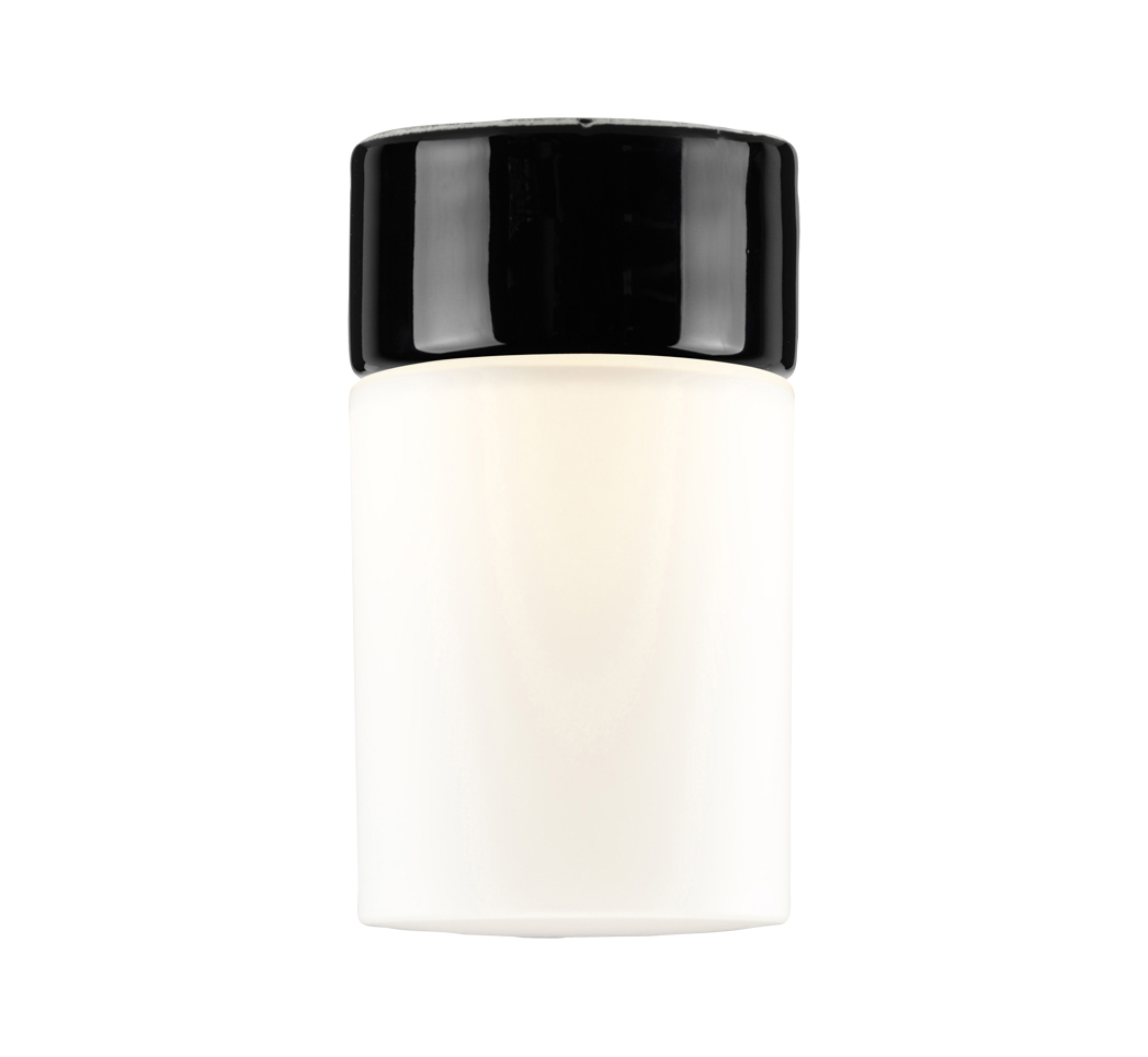 Valaisinrunko on posliinia, musta. Kupu valkoista, mattapintaista opaalilasia.