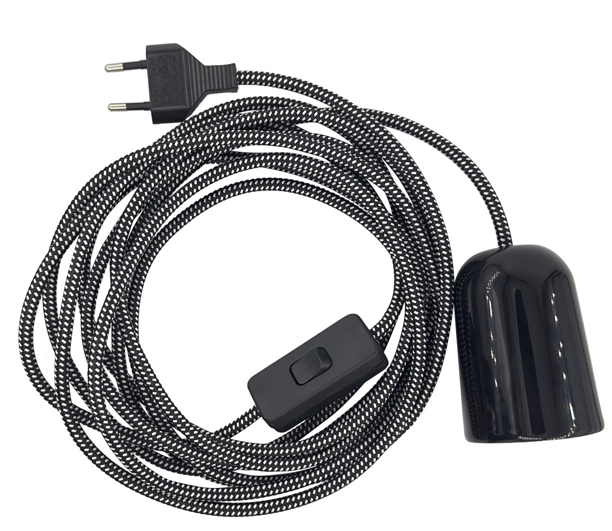 Valaisinjohto kangaspäälysteinen ja lampunkanta muovia, päällä musta posliininen suoja.