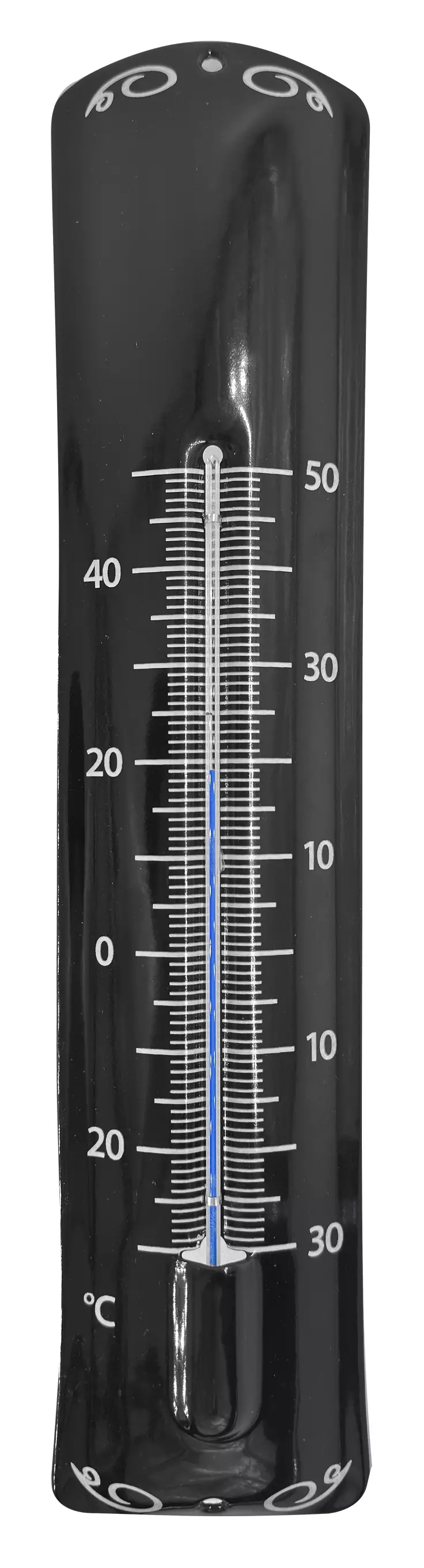 Kookas lämpömittari on emaloitu ja kestää hyvin ruostumatta myös ulkotiloissa.