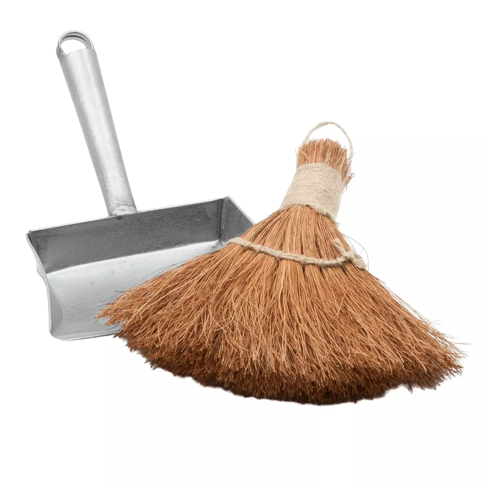 Suomalaisena käsityönä valmistetut harja ja pieni peltinen lapio toimivat hyvin mm. murujen siivoamiseen pöytäliinalta.