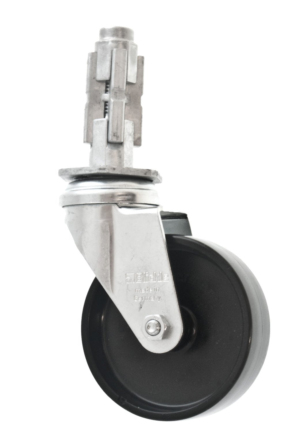 Metallisella paisuntaholkilla varustettu kääntyvä kalustepyörä sopii liitettäväksi putkihuonekalujemme putkeen, jonka sisähalkaisija on 27,2 mm (ulkohalkaisija 33,7 mm). Pyörässä on ns. kaksinkertainen kuulalaakerointi. Kääntyvä rengas on ilman jarrua.